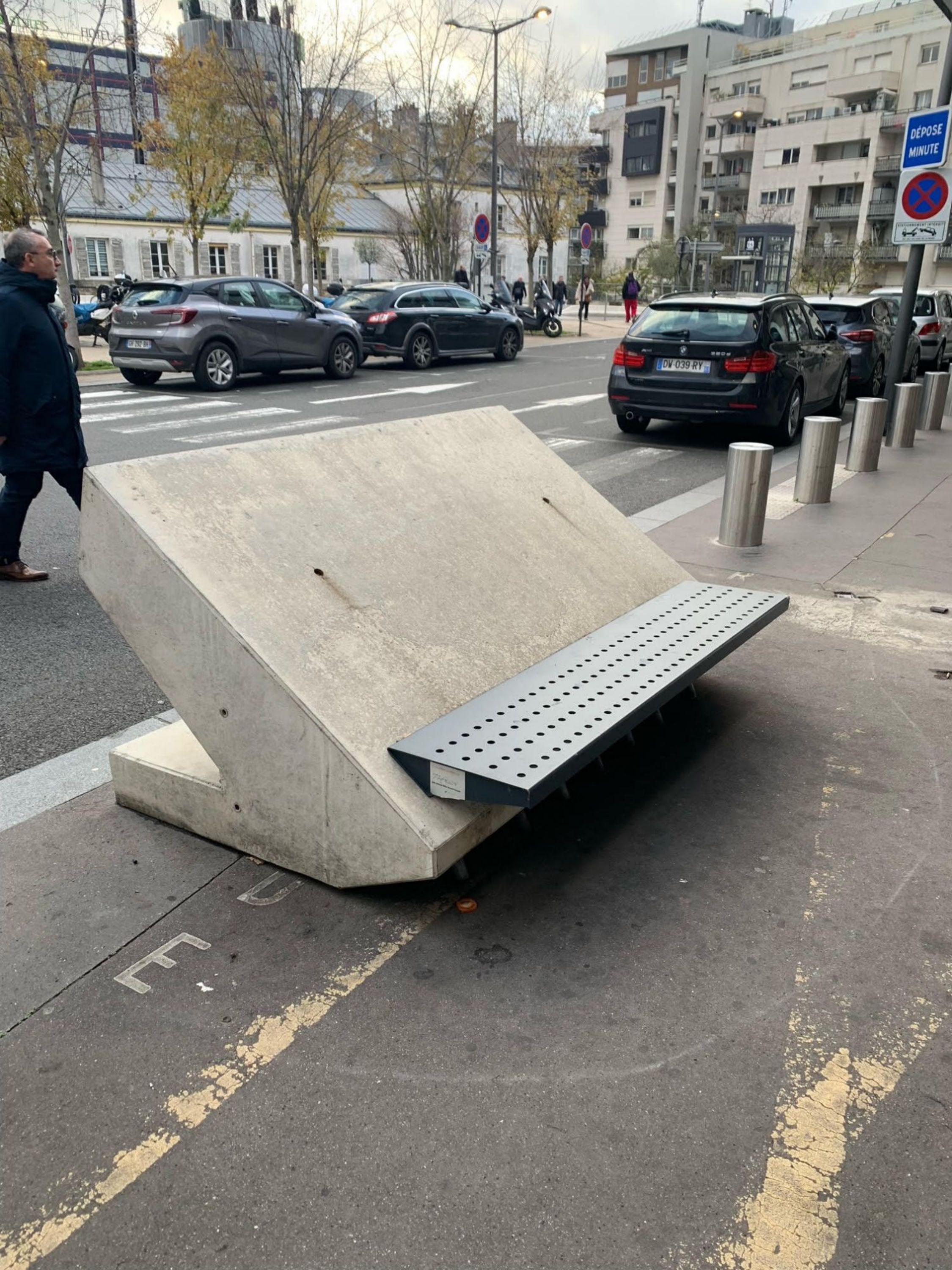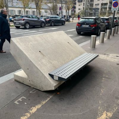 Le bloc anti-véhicule bélier comme le défini l’INPI dans le brevet est une borne de protection formant un mobilier urbain comportant des pointes d’accrochage au sol.
