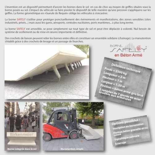 La borne Safely s'ancre dans le sol en cas de choc grâce aux griffes situées sous la borne. L’impact du véhicule fait pivoter la borne anti bélier en appliquant une pression sur les griffes, ainsi la forme géométrique en « Gueule de Requin » oblige les véhicules à s’encastrer.